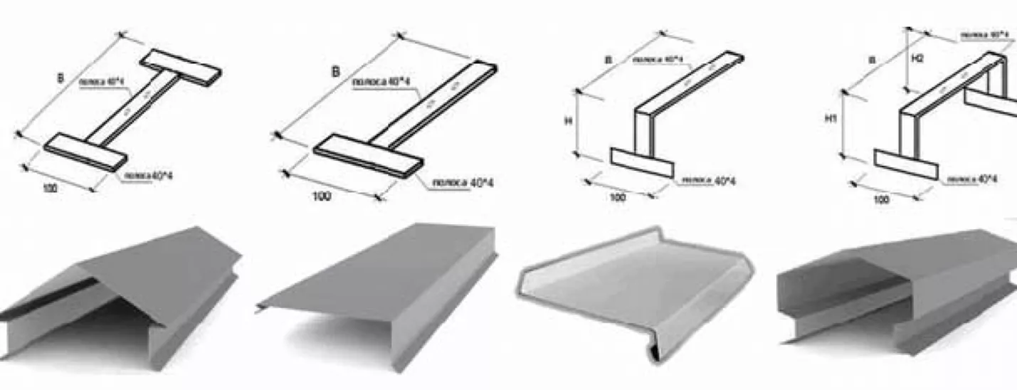 Размеры и форма комплектующих не стандартизируются, крепежно-несущие изделия производят по Техническим Условиями производителя. Конфигурацию выбирают исходя из формы и габаритов свесов, фартуков мест примыканий.